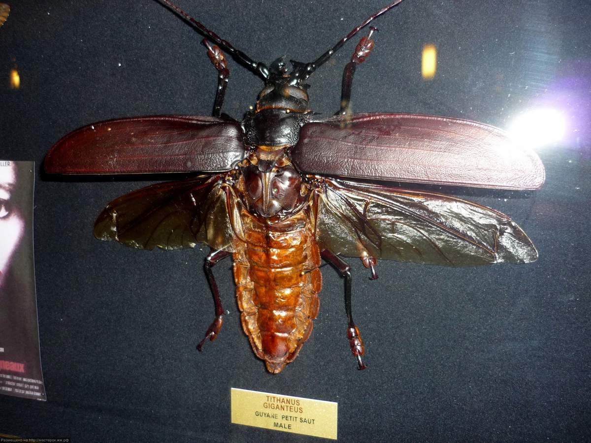 Титан – самый большой жук дровосек представитель отряда жесткокрылых, длина тела которого может достигать 22 сантиметров.
