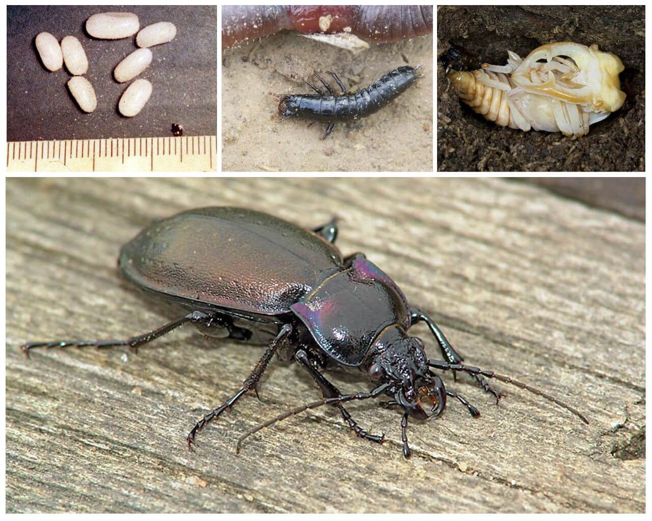 Живут жужелицы по меркам насекомых сравнительно долго — не менее трех лет. Чтобы стать взрослой, будущая особь претерпевает несколько стадий: яйцо, личинка, куколка и имаго.